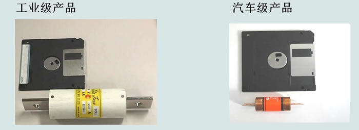 车规级对熔断器产品的小型化、轻量化要求更高 ,  工业级产品为了能有更大的分断能力,设计的体积较大,重量较重。